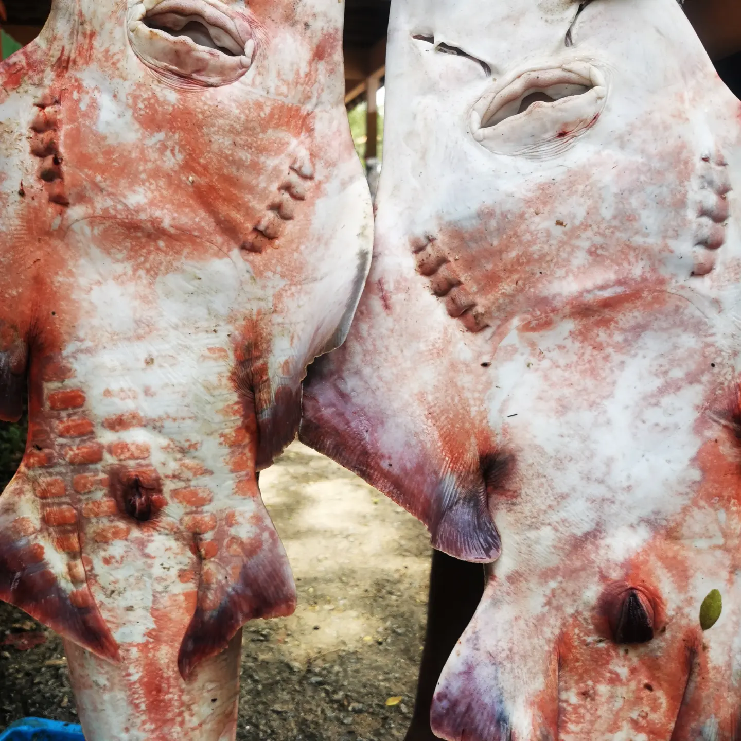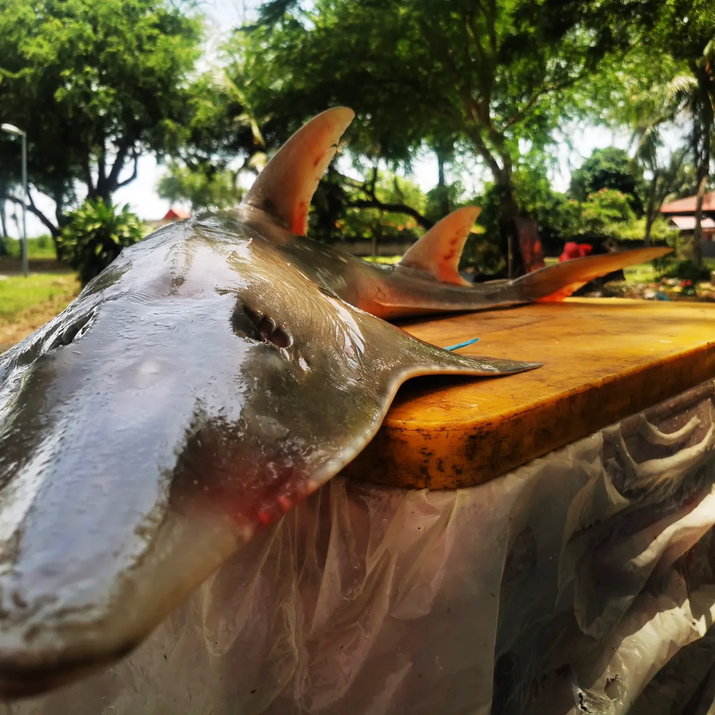 Fishermen and the small-scale traditional fishing communities in Melaka, complain about the declining numbers of fish near the coastline of the Straits, since the land reclamation started in 1995. To compensate for their loss in catch and income, these fishermen navigate their boats to deeper waters, further from the shoreline. But there they will find a different variety of marine species in their nets. Recently fishermen arrived at their fishing station with some exotic species, e.g. Wedgefish and Guitar-sharks. |