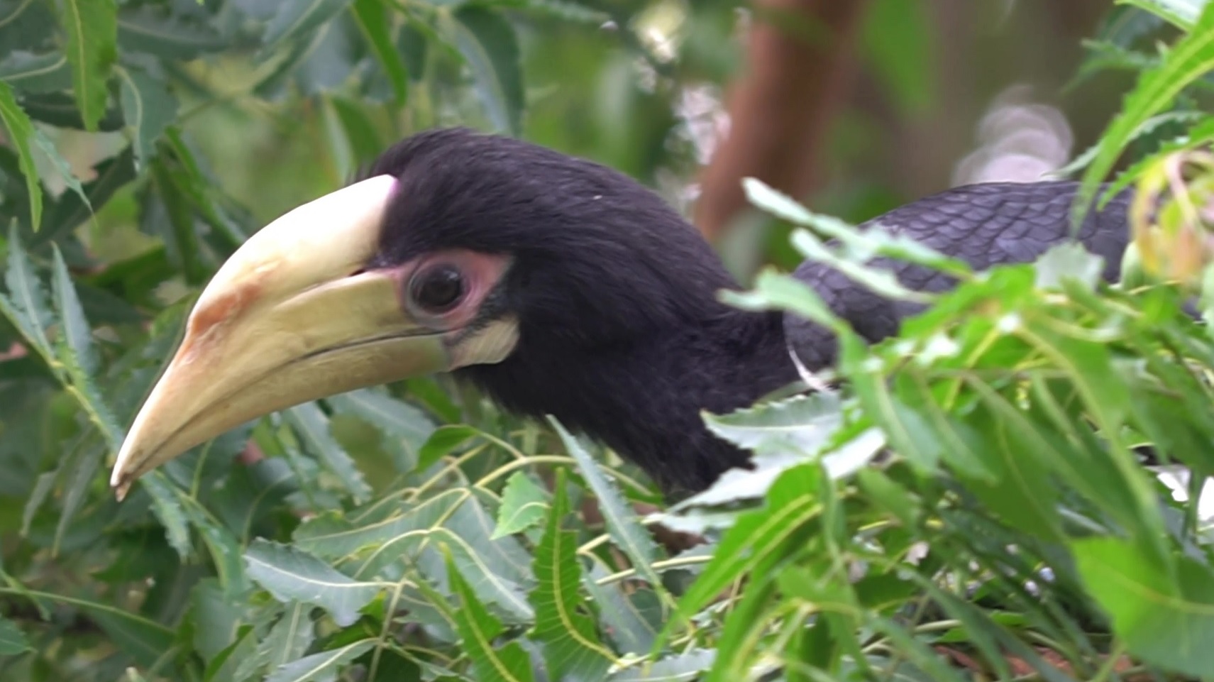 Hornbills are birds found in tropical and subtropical Africa, Asia and Melanesia. They have a long, down-curved bill which is brightly coloured and sometimes has a casque on top of the head. Both the common English and the scientific name of the family refer to the shape of the bill, "buceros" being "cow horn" in Greek. They are the only birds in which the first and second neck vertebrae (the atlas and axis respectively) are fused together. This probably provides a more stable platform for carrying the bill. Hornbills are omnivorous birds, eating fruit, insects and small animals. They cannot swallow food caught at the tip of the beak as their tongue is too short to manipulate it. So they toss food back to the throat with a jerk of the head, as you can clearly see in the video clip. Hornbills generally form monogamous pairs, although some species engage in cooperative breeding. The female lays up to six white eggs in existing holes or crevices, either in trees or rocks. Hornbills living in Southeast Asia are threatened with extinction. |
